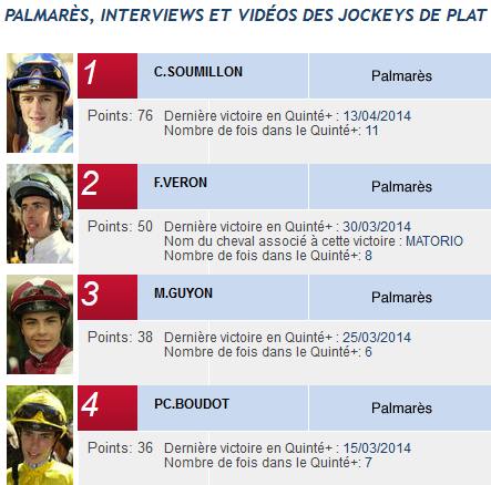 D'AUTRES VALEURS ÉTERNELLES Le meilleur entraîneur, le meilleur jockey ou driver... est une valeur sûre, qui elle aussi resiste au fil du temps. Remarquez bien: je ne parle pas des hommes en soi (Mr X, Mr Y...) mais DES MEILLEURS. Les hommes peuvent changer; ils changent d'ailleurs, au fil du temps, mais les meilleurs auront toujours d'excellentes résultats, bien supérieurs à la moyenne de leur confrères. De ce fait, lorsque vous serez amené à départager des concurrents, pensez à donner un coup d'oeil à la liste des meilleurs. Ce palmarès circule un peu partout sur internet. Prenez un site qui actualise souvent leur liste. ATTENTION. L'information fournie doit l'être obligatoirement en termes de pourcentage (de courses gagnées par rapports au courses courues) et non pas en termes de quantité. Je m'explique; si un individu a gagné 8 courses sur 10 (total de courses qu'il a courues), forcément qu'il méritera bien plus notre confiance qu'un autre en ayant gagné 20 ... mais sur un total de 150. Vous comprenez bien? Dans la premier cas, sa réussite est de 80% et dans le second seulement 13%. Dans le doute, vous pouvez aussi calculer leur moyenne de gains par course (tout comme pour les chevaux); cela vous permettra de les classer suivant leur classe. Prenez par exemple cette information: