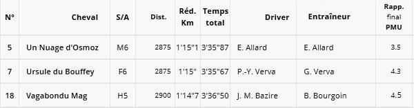- Misons donc € 14 sur le 5 Que se passera-t-il si l'un de ces trois concurrents gagne la course? Voyons: - si le 5 gagne, nous empocherons 14 x € 3,50 = € 49,00 Comme le total de nos mises est toujours de (14 + 11,50 + 11) = € 36,50, dans n'importe quel cas, nous serons bénéficiaires de 13 euros. L'arrivée fut: 1er le 7; 2ème le 18 et 3ème le 5. Si on avait joué juste les deux plus grosses moyennes de gains par course (le 18 et le 7), les chiffres auraient été: - disons (pour arrondir) 6 euros sur le 7 et Si le 7 gagne, on touche (6 x 4,3) = € 25,80 Avec des mises totales de 6 + 6 = 12 euros, dans n'importe cas on serait bénéficiaire de: 13,80 ou 15 euros.