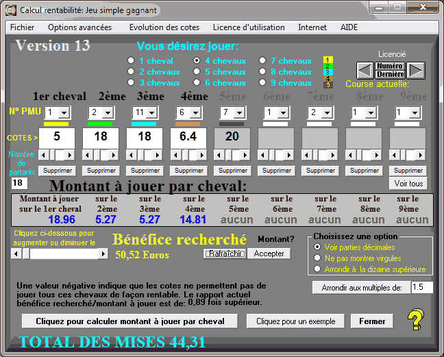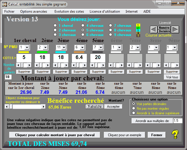 On peut jouer sans problème un total de 5 chevaux: - € 27 sur le 1 et quel que soit le cheval qui arrive en première place PARMI CES CINQ, on aura réalisé un profit de 65 euros.