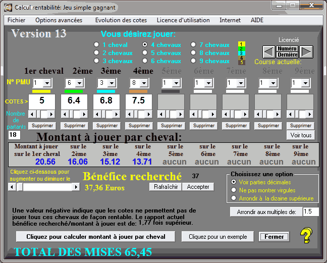 Dans le logiciel COTES elles apparaîtraient de telle façon qu'en voulant jouer 5 chevaux nous devrions miser 54 euros pour en récolter éventuellement€ 21. Hum... mauvaise affaire. Réduisons donc d'un cheval. Cela nous même à vérifier les 4 premières cotes, ainsi: En jouant 4 chevaux, l'affaire s'améliore un peu, mais sans pour autant devenir brillante: 65 euros de mises pour en récolter 37.