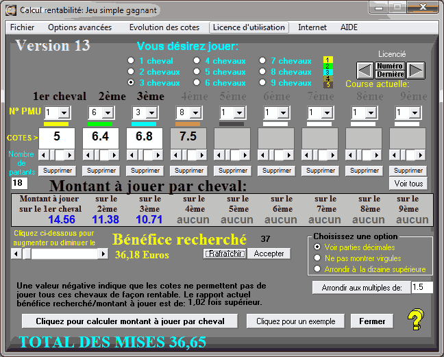 Vous faites bien ce que vous voulez, personnellement je me sens plus confortable enjouant 3 chevaux seulement, ce qui représente 36 euros d'investissement pour des gains potentiels de 36 euros: