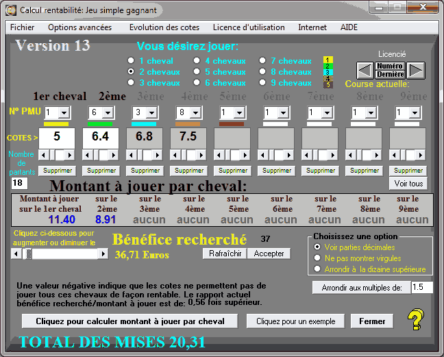 Le logiciel COTES permet de stipuler aisément le montant que vous voulez gagner et il vous donne instantanément le montant à jouer par cheval. C'est pratique, suite à une perte: vous pouvez alors augmenter les montants à gagner afin de composer les pertes. Puis revenir à des mises normales lorsque vous serez retombé sur vos pieds.